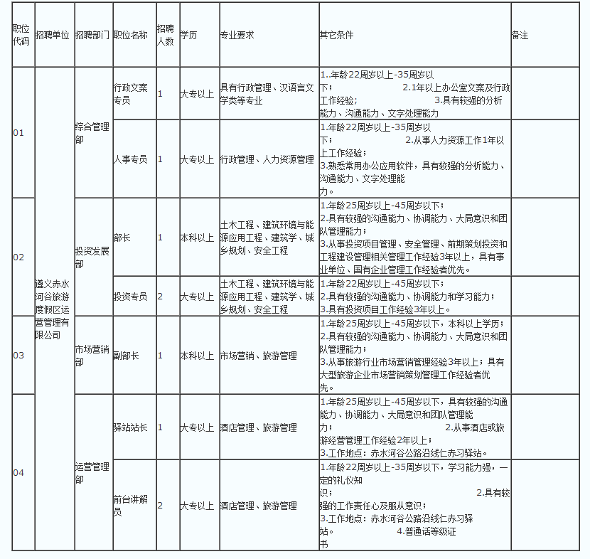遵义赤水河谷旅游度假区运营管理有限公司2019年公开招聘9名工作人员简章