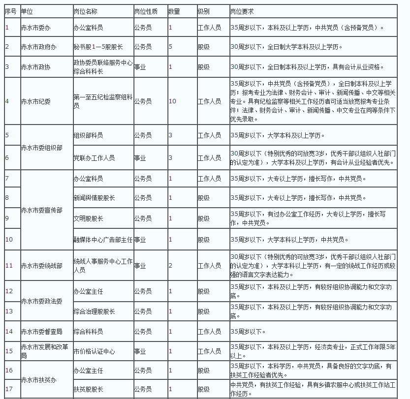 为优化我市机关事业单位干部队伍结构,参照《关于印发<遵义市市级机关事业单位公开遴选公务员和事业单位工作人员办法(试行)>的通知》(遵市人社通〔2017〕39号)等规定,经研究,决定开展赤水市市直单位2019年公开遴选干部工作,现公告如下。