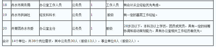 本次计划遴选机关事业单位干部共38名,详细职位见《赤水市市直单位2019年公开遴选干部职位表》(附件1)。